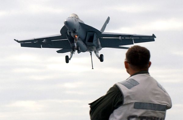 A Landing Signal Officer observes the F-18E Super Hornet, as it makes its final approach to make a corrected carrier landing.