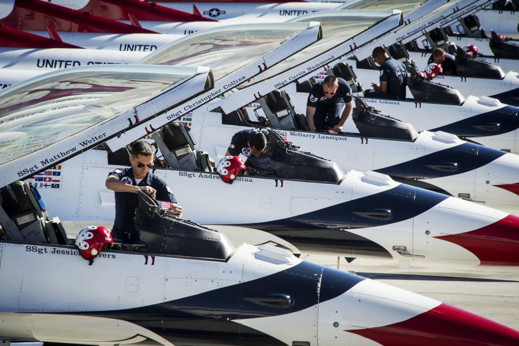 Airmen prepare their aircraft on Nellis Air Force Base, Nevada, February 1, 2015, to fly over the Super Bowl during the event later in the day. The airmen are assigned to the Air Force Thunderbirds air demonstration squadron.