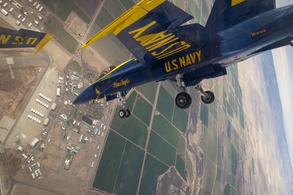 Navy flight demonstration squadron, the Blue Angels, Right Wing pilot Lt. Matt Suyderhoud flies in formation with the Diamond pilots over Naval Air Facility El Centro during a practice demonstration.