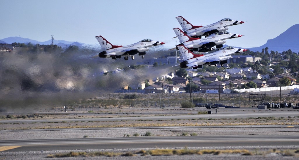 The U.S. Air Force Thunderbirds aerial demonstration team takes off for their performance November 8, 2014, during an open house event at Nellis Air Force Base, Nev.