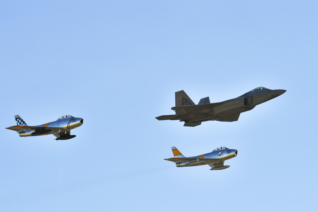: Two F-86 Sabres and an F-22 Raptor fly in formation during the 2015 Heritage Flight Training and Certification Course at Davis-Monthan AFB, Arizona, Feb. 27, 2015.